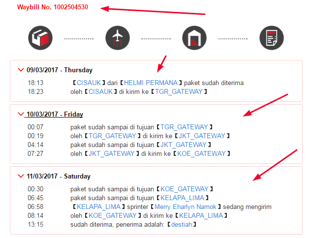 nantinya akan muncul data resi pengiriman secara mendetail mulai dari nama pengirim,nama penerima,kota pengirim dan penerima.lokasi paket anda saat ini,sudah di terima apa belum akan muncul secara jelas.silahkan lihat gambar di atas.